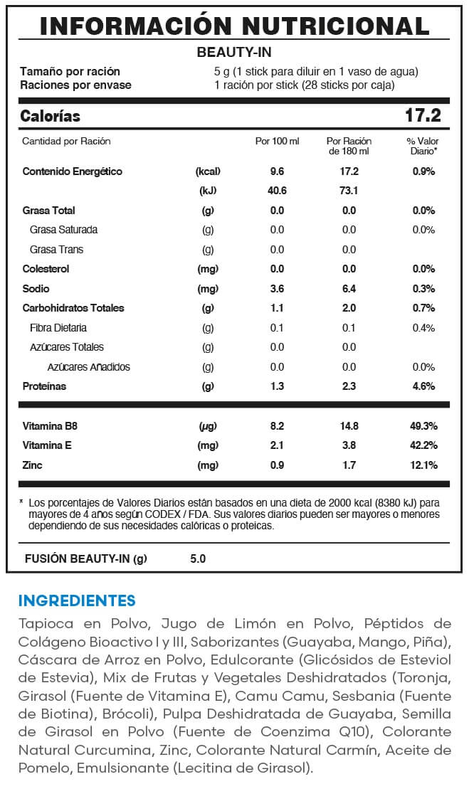 Delicioso refresco nutritivo de guayaba con una potente combinación de péptidos de colágeno bioactivo que nutren tu piel desde adentro, para que luzca radiante y juvenil, por más tiempo. Beauty-In utiliza colágeno optimizado (cuatro veces más potente que el colágeno convencional), que estimula a las células de la piel a producir más colágeno y elastina, trabajando en sinergia con los antioxidantes y vitaminas presentes en su formulación, para una piel rejuvenecida.