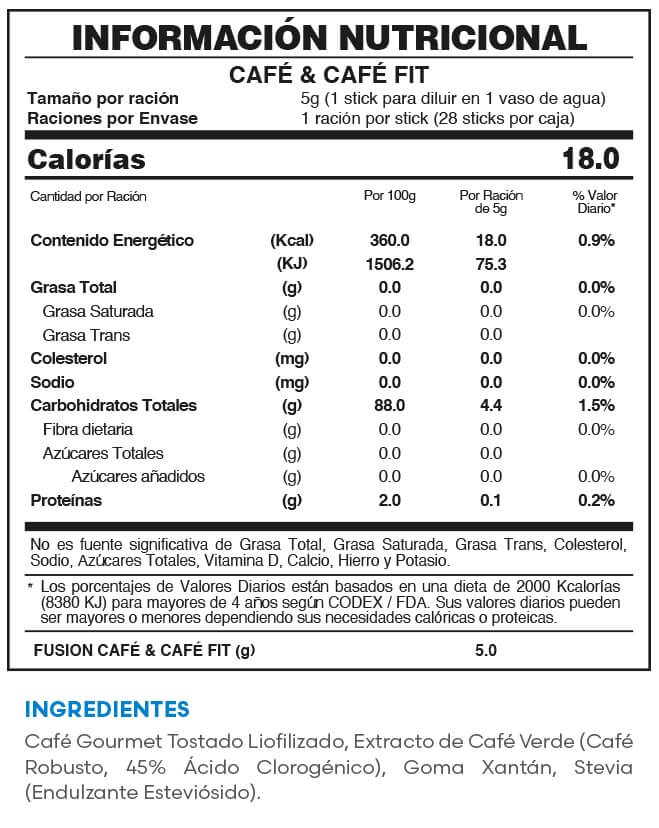 Delicioso café gourmet tostado y liofilizado, enriquecido con extracto de café verde, formulación única de ácidos clorogénicos que mejoran el metabolismo de la glucosa y la grasa, apoyando el control de medidas y peso corporal. Complemento ideal de una dieta baja en calorías.
