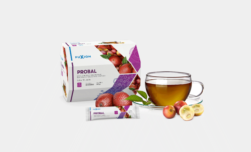Suplemento alimenticio en polvo con extractos frutales, té negro y orégano.