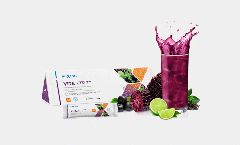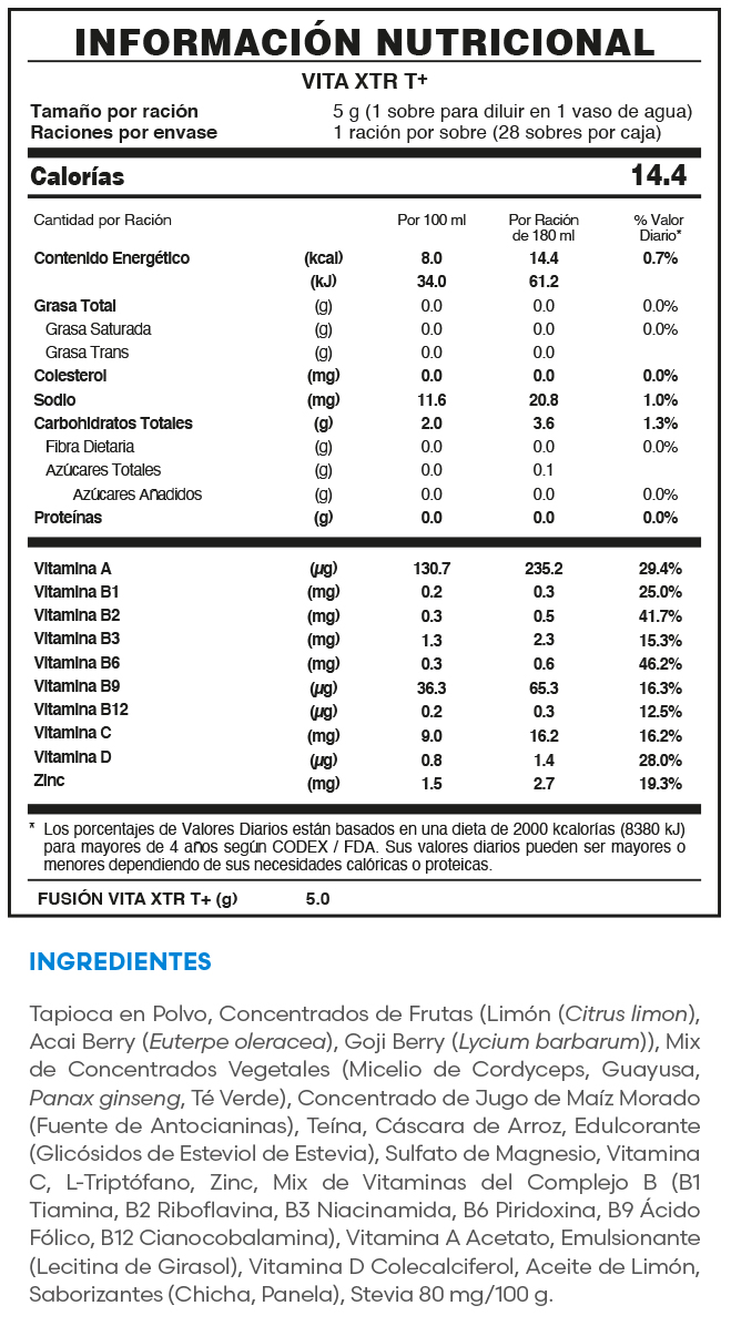 Suplemento alimenticio en polvo con extractos vegetales, antocianina, vitaminas y minerales.