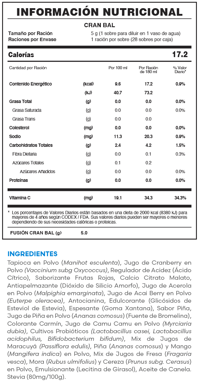 Suplemento alimenticio con inulina de achicoria y extractos frutales.
