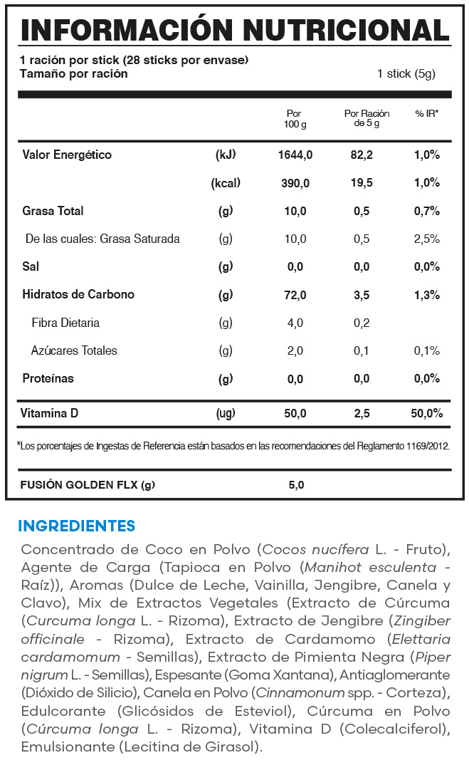 Delicioso té de especias con leche de coco, hecho a base de cúrcuma orgánica certificada de efecto antioxidante y protector. Los curcuminoides extraídos de la cúrcuma trabajan en sinergia con el jengibre, el cardamomo y la pimienta negra para mantener la flexibilidad de las articulaciones.