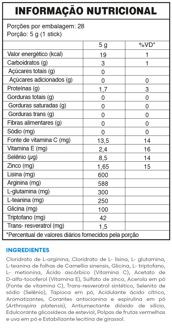 Combinação de aminoácidos com antioxidantes naturais como o resveratrol, café verde e superfrutos como a blueberry, mirtilo, além de Minerais como o Cobre, Selênio e Zinco. Em conjunto, trabalham em sinergia para reduzir os radicais livres em diferentes partes do organismo, assim como para nutrir a glândula pituitária, responsável de segregar o chamado hormônio da juventude.