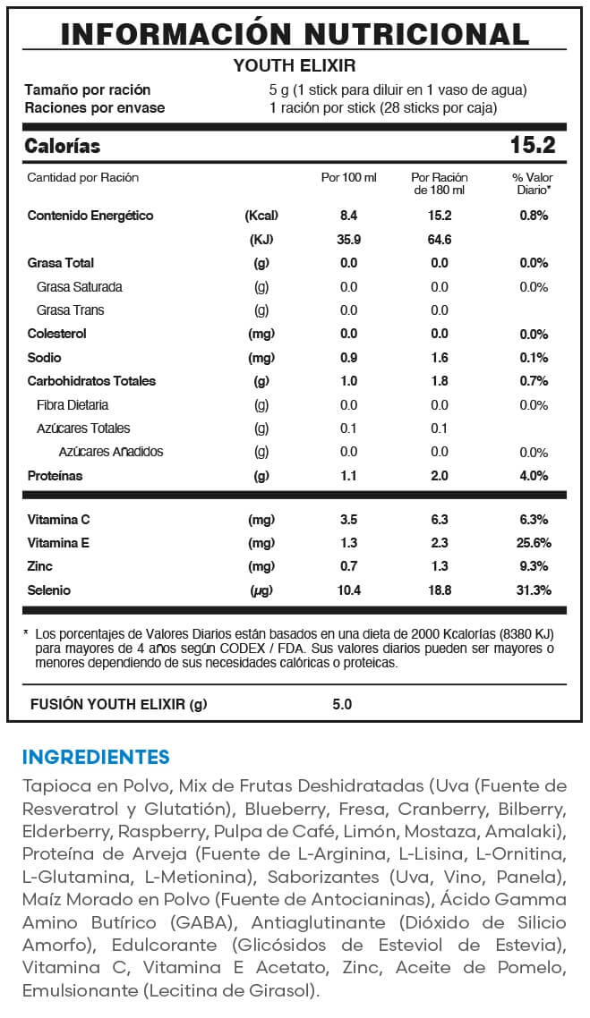 Combinación natural de aminoácidos con antioxidantes como el resveratrol, extraído de la uva del vino y súper frutas como blue-berries, sauco y amalaki que trabajan sinérgicamente para reducir los radicales libres y nutrir la glándula pituitaria, responsable de segregar la hormona de la juventud.
