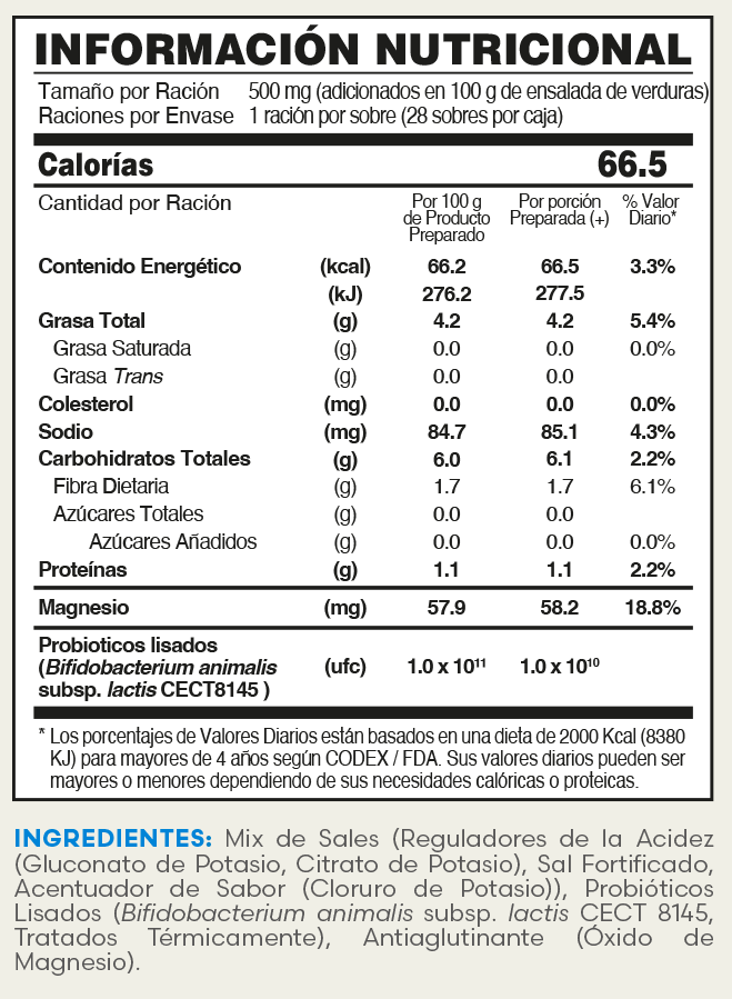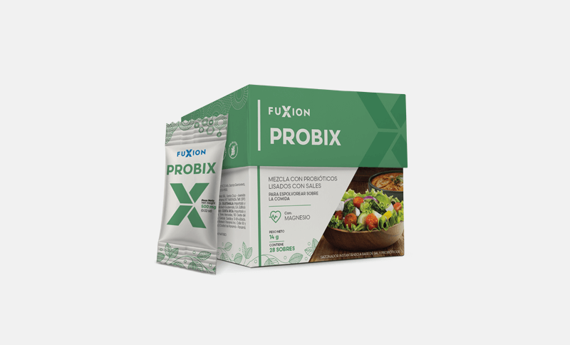 PROBIX es la nueva combinación de probióticos lisados con sales naturales, para espolvorear sobre tus comidas. Cada sobre de Probix contiene 10 mil millones de probióticos lisados que ayudan a regular el metabolismo, de tal forma que su consumo diario contribuye a eliminar la grasa visceral, la más difícil de eliminar y la más peligrosa porque se sitúa alrededor de los órganos, mientras reduces la medida del abdomen.