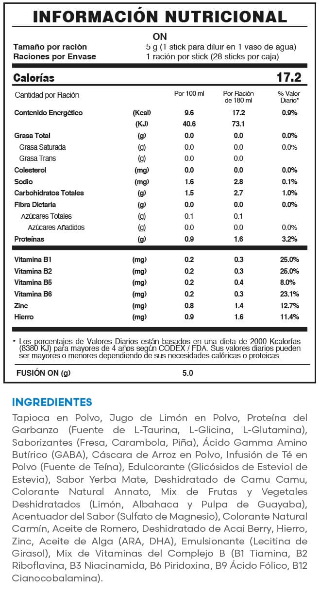 Deliciosa bebida funcional que actúa a nivel neuronal, activando la mente y preparándote para estar más alerta. ON está hecho en base a Taurina y Extracto de Yerba Mate, dos estimulantes naturales para el cerebro que ayudan a incrementar tu entusiasmo. Ambos trabajan en sinergia con la Vitamina C para potenciar los procesos antioxidantes; y con minerales, aceites esenciales y aminoácidos que contribuyen a mejorar la nutrición neuronal.