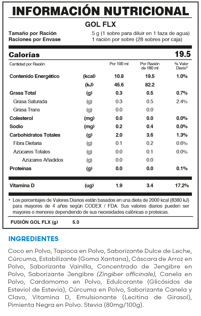 Suplemento alimenticio en polvo a base de coco, cúrcuma y especias.