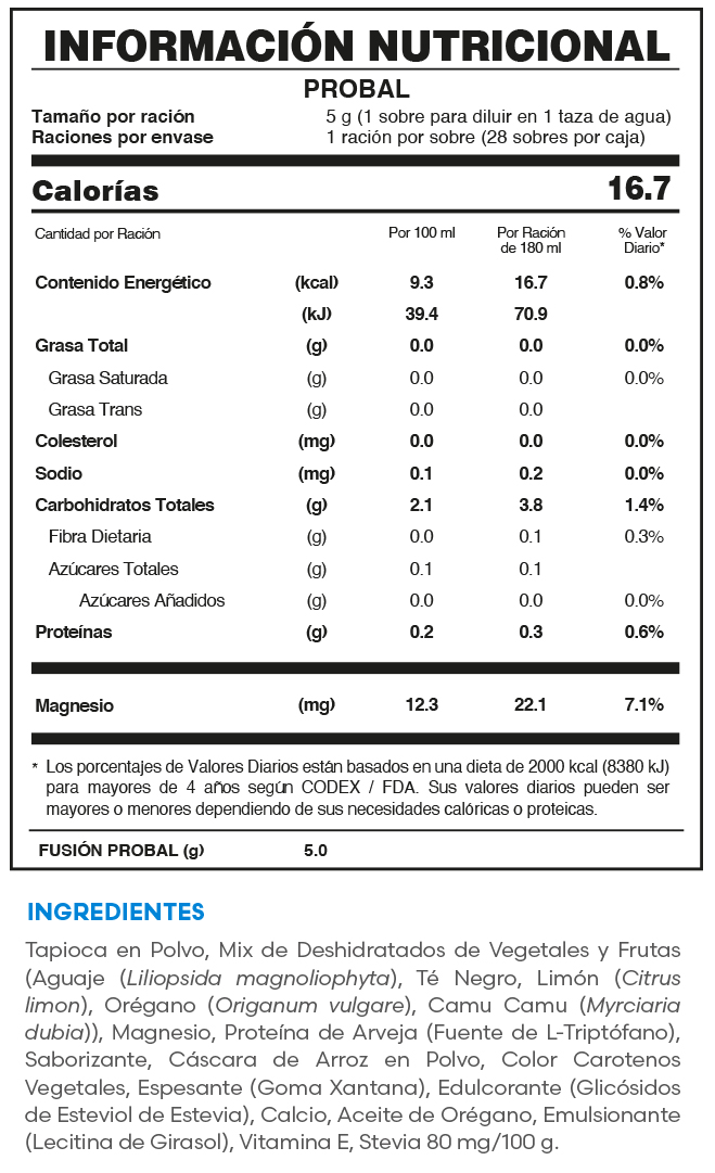 Suplemento alimenticio en polvo con extractos frutales, té negro y orégano.